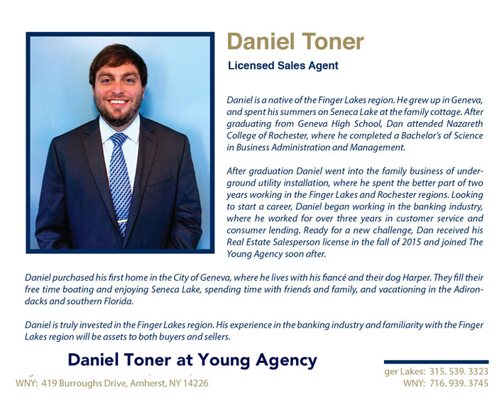 After graduation Daniel went into the family business of underground utility installation, where he spent the better part of two years working in the Finger Lakes and Rochester regions. Looking to start a career, Daniel began working in the banking industry, where he worked for over three years in customer service and consumer lending. Ready for a new challenge, Dan received his real estate salesperson license in the fall of 2015 and joined The Young Agency soon after.