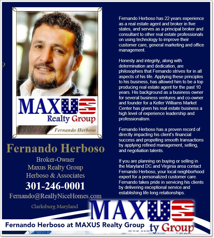 If you are planning on buying or selling in the Maryland DC and Virginia area contact Fernando Herboso, your local neighborhood expert for a personalized customer care. Fernando takes pride in servicing his clients by delivering exceptional service and establishing lifelong relationships.”