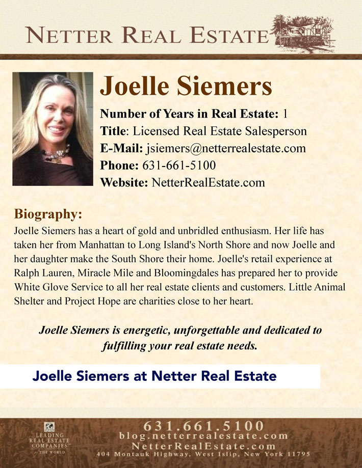 “Joelle Siemers has a heart of gold and unbridled enthusiasm. Her life has taken her from Manhattan to Long Island’s North Shore and now Joelle and her daughter make the South Shore their home. Joelle’s retail experience at Ralph Lauren, Miracle Mile and Bloomingdales has prepared her to provide While Glove Service to all her real estate clients and customers. Little Animal Shelter and Project Hope are charities close to her heart.