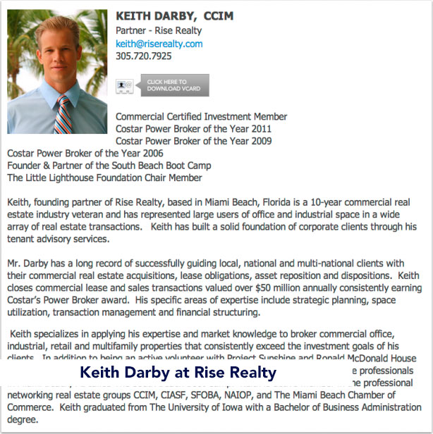 “Keith, founding partner of Rise Realty, based in Miami Beach, Florida is a 10-year commercial real estate industry veteran and has represented large users of office and industrial space in a wide array of real estate transactions. Keith has built a solid foundation of corporate clients through his tenant advisory services.