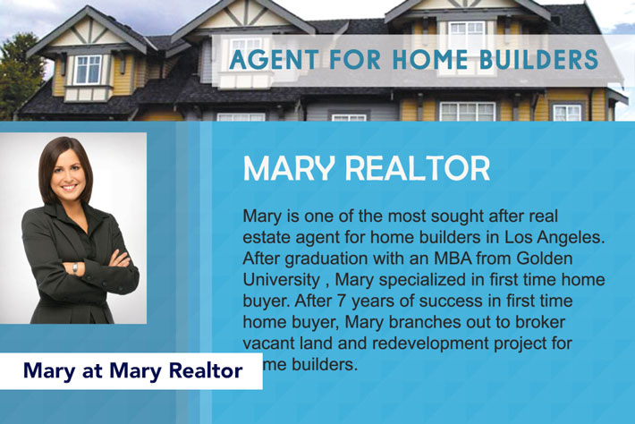 [your_name] is one of the most sought after real estate agent for home builders in [your_location]. After graduation with [your_degree] from [your_school], [your_name] specialized in [your_specialty]. After [years] years of success in [your_specialty], [your_name] branches out to [what_you_do_now].