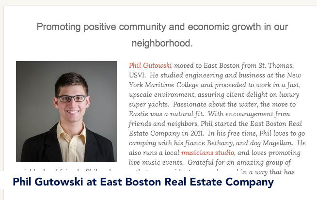 “Phil Gutowski moved to East Boston from St. Thomas, USVI. He studied engineering and business at the New York Maritime College and proceeded to work in a fast upscale environment, assuring client delight on luxury super yachts. Passionate about the water, the move to Eastie was a natural fit. With encouragement from friends and neighbors, Phil started the East Boston Real Estate Company in 2011. In his free time, Phil loves to go camping with his fiance Bethany, and dog Magellan. He also runs a local musicians studio, and loves promoting live music events. Grateful for an amazing group of neighborhood friends, Phil makes sure that new residents are welcomed in a way that has become customary in East Boston.”