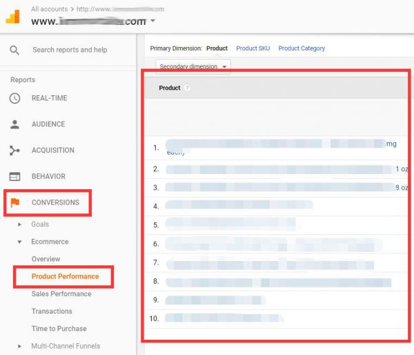 To view top selling product reports, navigate to Conversions >> Ecommerce >> Product Performance.