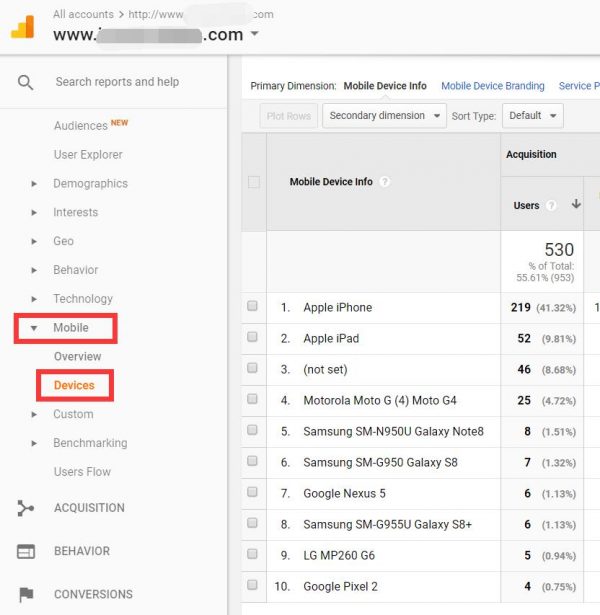 Google Analytics can also collect the mobile device information of your audience. The device report in Google Analytics is very helpful to track what are the mobile devices your visitor uses and how your site is performing on those mobile devices. To view device reports navigate to Audience >> Mobile >> Devices.