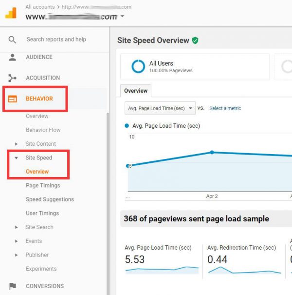Check your site loading time in Google Analytics reporting tab by navigating to Behavior >> Site Speed >> Overview.